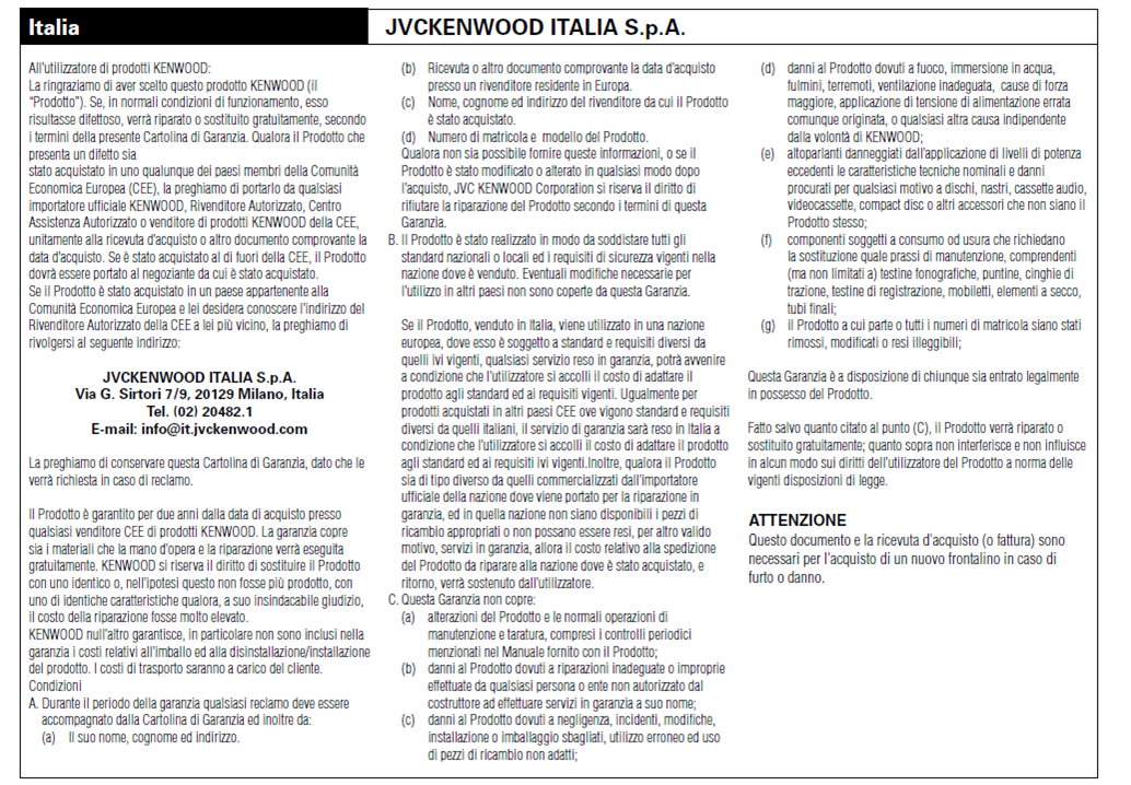 In aggiunta a tale Garanzia Legale di Conformità fornita dal venditore, JVCKENWOOD Le offre una ulteriore garanzia, detta garanzia convenzionale. Qui di seguito sono indicati in dettaglio i termini e le condizioni della Garanzia Convenzionale