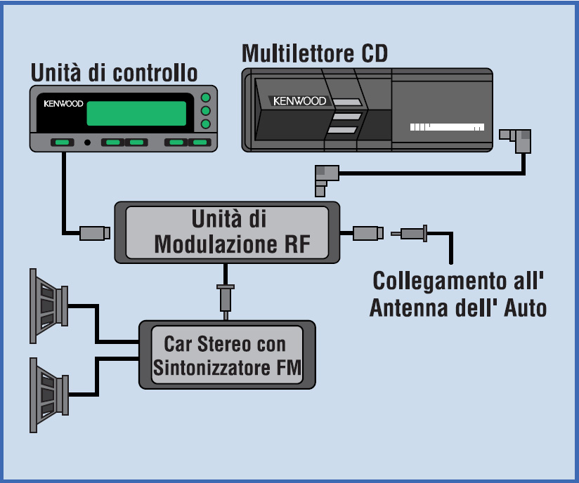 FAQ /Car Entertainment /KENWOOD /Accessori e interfacce Il monitor visualizza fino a 1280 brani, anche se l'iPod ne contiene molti di piu Riproduzione sonora di una sorgente AUX tramite sintolettore Utilizzo degli External Switches presenti nei sintomonitor Il mio sintolettore non ha il controllo del multilettore, posso comunque collegare un multilettore CD? E' possibile dotare il proprio impianto di un multilettore CD anche se il sintolettore non dispone di controllo per il multilettore, grazie ad un modulatore FM Kenwood mod. KCA-R71FM. Questo modulatore dispone di un telecomando e di un display ed e specificatamente studiato per questa specifica esigenza. Agendo sulla gamma FM e utilizzando la connessione di antenna, trasmette al sintolettore il segnale proveniente dal CD ad una frequenza stabilita, memorizzando la stessa frequenza in una memoria del sintolettore e possibile ascoltare il segnale proveniente dal CD. Sul display in dotazione e possibile visualizzare il numero di traccia e avanzamento brano in ascolto e tramite il telecomando e possibile avere tutti i comandi che si trovano a disposizione nei sintolettori previsti con controllo di multilettori CD. Posso utilizzare un multilettore CD Kenwood con il mio sintolettore installato di serie? Il mio sintolettore CD e telecomandabile ? Come posso avere altri ingressi audio (come USB e AUX) per il mio sintolettore? Cosa fare in caso di smarrimento del manuale di istruzioni La garanzia e valida solo se accompagnata dallo scontrino fiscale o dalla fattura?