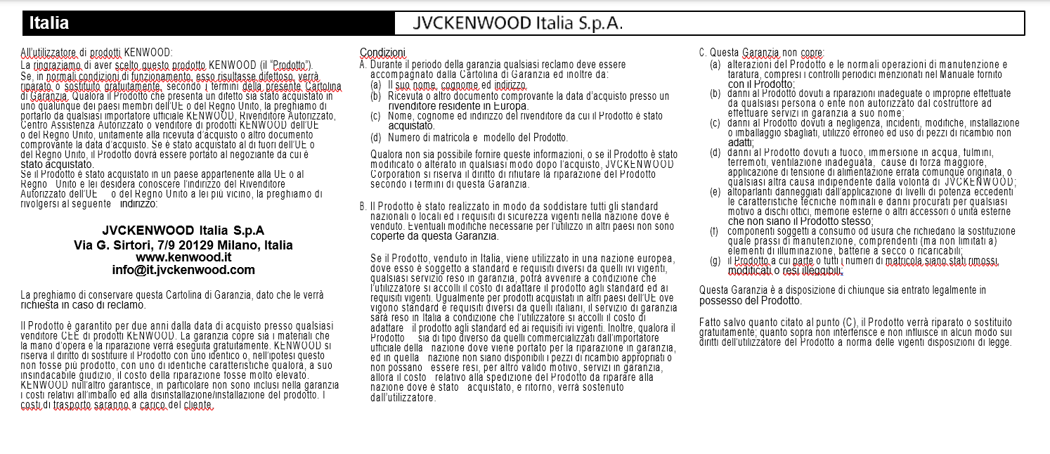 JVCKENWOOD Italia S.p.A. riconosce due anni di garanzia per tutti i prodotti distribuiti, senza eccezioni, con le modalità definite dalla vigente normativa per le vendite ad utenti privati (Codice del consumo - Dlgs 06-09-2005, No.206 e successive modifiche).